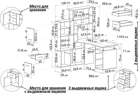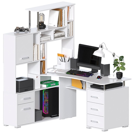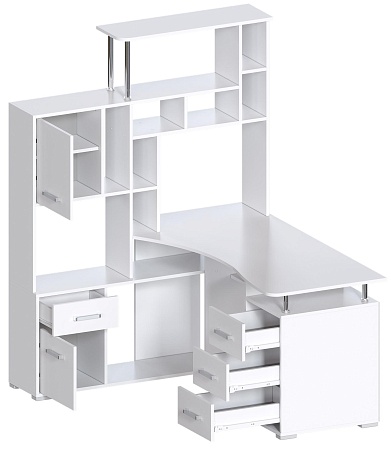 Большой компьютерный стол со стеллажом, идеально впишется в угол комнаты. Белый цвет (гладкий, матовый) - очень актуален в современном интерьере. Вариант расположения стеллажа нужно выбрать при оформлении заказа. Размер столешницы 146х63 см. Конструкция стола с множеством полок и ящиков - максимально грамотно использован каждый сантиметр изделия.