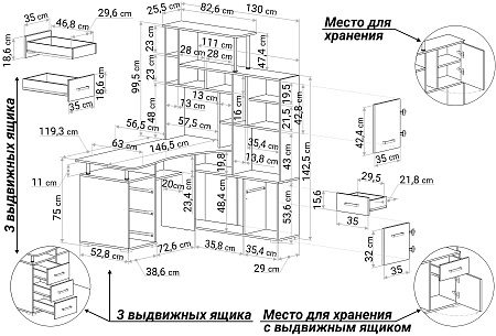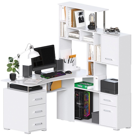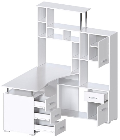 Большой компьютерный стол со стеллажом, идеально впишется в угол комнаты. Белый цвет (гладкий, матовый) - очень актуален в современном интерьере. Вариант расположения стеллажа нужно выбрать при оформлении заказа. Размер столешницы 146х63 см. Конструкция стола с множеством полок и ящиков - максимально грамотно использован каждый сантиметр изделия.