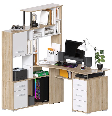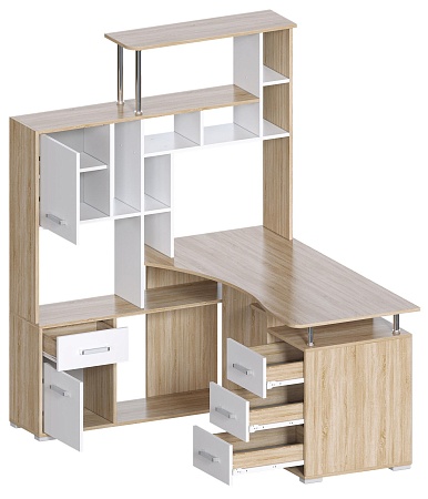 Большой компьютерный стол со стеллажом, идеально впишется в угол комнаты. Дуб Санома/Белый цвет (гладкий, матовый) - очень актуален в современном интерьере. Вариант расположения стеллажа нужно выбрать при оформлении заказа. Размер столешницы 146х63 см. Конструкция стола с множеством полок и ящиков - максимально грамотно использован каждый сантиметр изделия.
