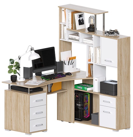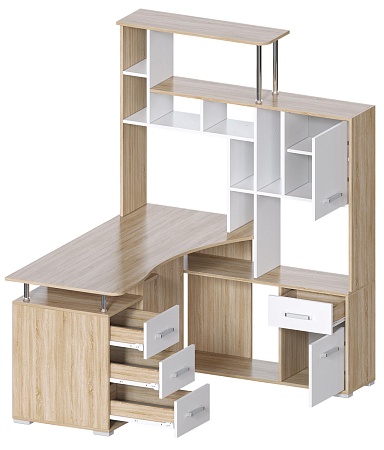 Большой компьютерный стол со стеллажом, идеально впишется в угол комнаты. Дуб Санома/Белый цвет (гладкий, матовый) - очень актуален в современном интерьере. Вариант расположения стеллажа нужно выбрать при оформлении заказа. Размер столешницы 146х63 см. Конструкция стола с множеством полок и ящиков - максимально грамотно использован каждый сантиметр изделия.