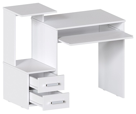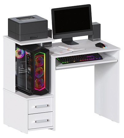 Компактный компьютерный стол шириной 100 см, в актуальном Белом цвете. Есть место под системный блок. Эргономичная конструкция обеспечивает столу отличную функциональность. Стол Джаз-24 оснащен полкой под клавиатуру, двумя выдвижными ящиками, местом под системный блок и полкой для оргтехники. Джаз-24 можно использовать как стол для ноутбука. В этом случае место под системный блок будет служить полкой для любых вещей.