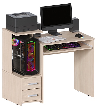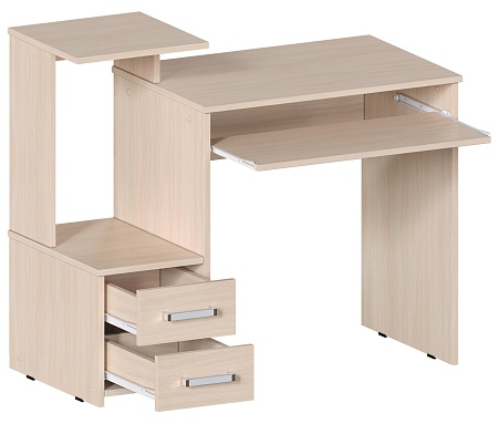 Компактный компьютерный стол шириной 100 см, в актуальном Дуб Молочный цвете. Есть место под системный блок. Эргономичная конструкция обеспечивает столу отличную функциональность. Стол Джаз-24 оснащен полкой под клавиатуру, двумя выдвижными ящиками, местом под системный блок и полкой для оргтехники. Джаз-24 можно использовать как стол для ноутбука. В этом случае место под системный блок будет служить полкой для любых вещей.