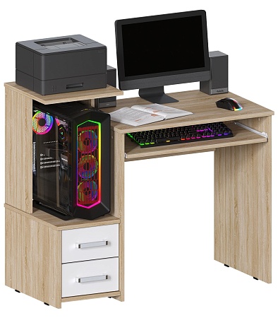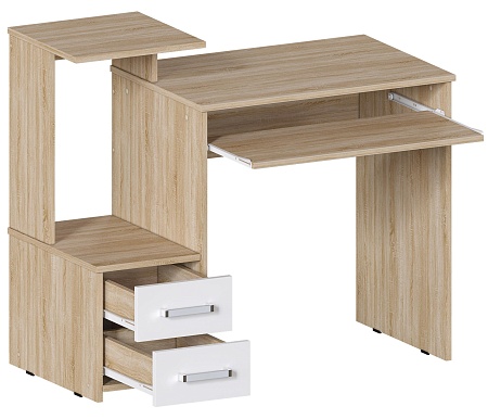 Компактный компьютерный стол шириной 100 см, в актуальном Дуб Санома/Белый цвете. Есть место под системный блок. Эргономичная конструкция обеспечивает столу отличную функциональность. Стол Джаз-24 оснащен полкой под клавиатуру, двумя выдвижными ящиками, местом под системный блок и полкой для оргтехники. Джаз-24 можно использовать как стол для ноутбука. В этом случае место под системный блок будет служить полкой для любых вещей.