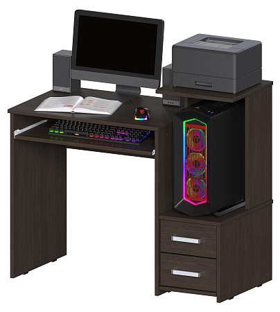 Компактный компьютерный стол шириной 100 см, в актуальном Венге цвете. Есть место под системный блок. Эргономичная конструкция обеспечивает столу отличную функциональность. Стол Джаз-24 оснащен полкой под клавиатуру, двумя выдвижными ящиками, местом под системный блок и полкой для оргтехники. Джаз-24 можно использовать как стол для ноутбука. В этом случае место под системный блок будет служить полкой для любых вещей.