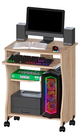 Компактный коомпампьютерный стол на колесиках, цвет Дуб Санома. Джаз-27, несмотря на небольшие размеры, обладает отличной функциональностью: есть выдвижная полка под клавиатуру, полочки разных размеров, где можно разместить канцелярские принадлежности, и даже небольшой принтер. А также предусмотрено место под системный блок. Поэтому стол подходит как для ноутбука, так и для компьютера.