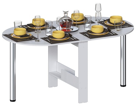 Очень удобный овальный стол-книжка для малогабаритных комнат, будь то кухня или гостиная. Актуальный белый цвет подойдет под любой интерьер. Овальная форма экономит место в комнате, но в то же время размер стола достаточный для комфортного размещения минимум 4-х человек. Каждая сторона откидной столешницы опирается на 1 хромированную ножку, что позволяет быстро собрать стол, а возможность регулировки высоты ножек обеспечивает отличную устойчивость. Ножки диаметром 60 мм.