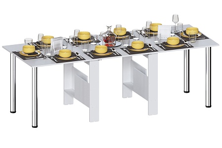 Большой стол-книжка с раздвижной центральной секцией. Благодаря ширине 223 см в разложенном виде, за столом могут комфортно разместиться 12 человек. За счет хромированных ножек стол эффектно смотрится и устойчив, т.к. с каждого края предусмотрено 2 ножки с надежным металлическим креплением и регулировкой ножек по высоте.
